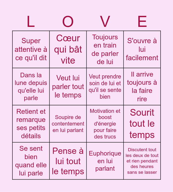 This bingo card has 16 words: Pense à lui tout le temps, Sourit tout le temps, Toujours en train de parler de lui, Super attentive à ce qu'il dit, Retient et remarque ses petits détails, Cœur qui bât vite, Motivation et boost d'énergie pour faire des trucs, Euphorique en lui parlant, Dans la lune depuis qu'elle lui parle, Veut lui parler tout le temps, Se sent bien quand elle lui parle, S'ouvre à lui facilement, Soupire de contentement en lui parlant, Il arrive toujours à la faire rire, Veut prendre soin de lui et qu'il se sente bien and Discutent tout les deux de tout et rien pendant des heures sans se lasser.