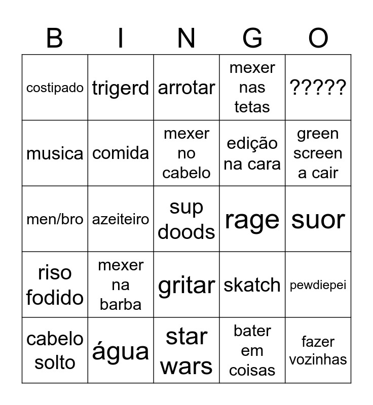 This bingo card has a free space and 24 words: mexer na barba, água, mexer no cabelo, cabelo solto, ?????, costipado, musica, trigerd, rage, gritar, edição na cara, men/bro, skatch, pewdiepei, comida, bater em coisas, suor, arrotar, green screen a cair, azeiteiro, fazer vozinhas, riso fodido, mexer nas tetas and star wars.