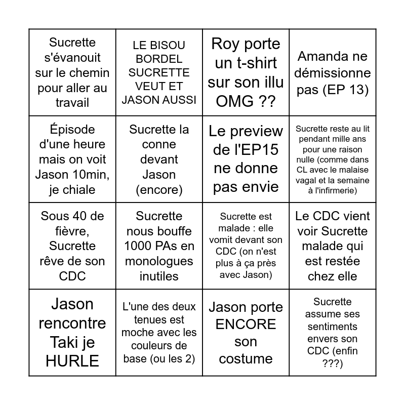 This bingo card has 16 words: L'une des deux tenues est moche avec les couleurs de base (ou les 2), Le CDC vient voir Sucrette malade qui est restée chez elle, Roy porte un t-shirt sur son illu OMG ??, Sucrette s'évanouit sur le chemin pour aller au travail, Sous 40 de fièvre, Sucrette rêve de son CDC, LE BISOU BORDEL SUCRETTE VEUT ET JASON AUSSI, Sucrette est malade : elle vomit devant son CDC (on n'est plus à ça près avec Jason), Jason porte ENCORE son costume, Épisode d'une heure mais on voit Jason 10min, je chiale, Sucrette la conne devant Jason (encore), Jason rencontre Taki je HURLE, Amanda ne démissionne pas (EP 13), Sucrette nous bouffe 1000 PAs en monologues inutiles, Sucrette reste au lit pendant mille ans pour une raison nulle (comme dans CL avec le malaise vagal et la semaine à l'infirmerie), Le preview de l'EP15 ne donne pas envie and Sucrette assume ses sentiments envers son CDC (enfin ???).