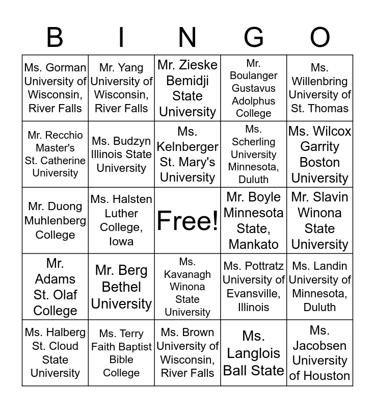This bingo card has a free space and 24 words: Mr. Berg Bethel University, Ms. Terry Faith Baptist Bible College, Ms. Kelnberger St. Mary's University, Ms. Halberg St. Cloud State University, Ms. Willenbring University of St. Thomas, Ms. Gorman University of Wisconsin, River Falls, Mr. Recchio Master's St. Catherine University, Mr. Yang University of Wisconsin, River Falls, Mr. Boyle Minnesota State, Mankato, Ms. Kavanagh Winona State University, Ms. Scherling University Minnesota, Duluth, Mr. Duong Muhlenberg College, Ms. Pottratz University of Evansville, Illinois, Ms. Landin University of Minnesota, Duluth, Ms. Budzyn Illinois State University, Ms. Langlois Ball State, Mr. Slavin Winona State University, Mr. Zieske Bemidji State University, Ms. Wilcox Garrity Boston University, Ms. Halsten Luther College, Iowa, Ms. Jacobsen University of Houston, Mr. Adams St. Olaf College, Mr. Boulanger Gustavus Adolphus College and Ms. Brown University of Wisconsin, River Falls.