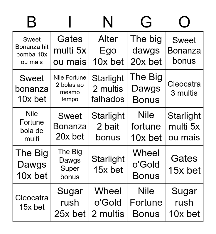 This bingo card has a free space and 64 words: Gates Bonus, Gates 2 multi falhados, Gates 2 multi hit, Gates 15x bet, Gates 25x bet, Gates 2 bait bonus, Gates multi 5x ou mais, Starlight Bonus, Starlight 2 multis falhados, Starlight 2 multi hit, Starlight 15x bet, Starlight 25x bet, Starlight multi 5x ou mais, Sweet Bonanza bonus, Sweet Bonanza 3 bait bonus, Sweet bonanza 10x bet, Sweet Bonanza 20x bet, Sweet Bonanza hit bomba 10x ou mais, Sweet bonanza 2 bombas falhadas, The Big Dawgs Bonus, The Big Dawgs Super bonus, The Big Dawgs 10x bet, The big dawgs 20x bet, The Big Dawgs 2 bait bonus, The Big Dawgs Cao pequeno, The Big Dawgs Cao Grande, Dog House Dog or Alive Bonus, Dog House Dog or Alive 3 bait bonus, Dog House Dog or Alive hit 2 multi, Dog House Dog or Alive 10x bet, Dog House Dog or Alive 25x bet, Cleocatra Bonus, Cleocatra 3 bait bonus, Cleocatra feature, Cleocatra 3 multis, Cleocatra 15x bet, Cleocatra 25x bet, Nile Fortune Bonus, Nile Fortune 3 bait bonus, Nile Fortune 2 bolas ao mesmo tempo, Nile Fortune bola de multi, Nile fortune 10x bet, Nile fortune 20x bet, Sugar Rush bonus, Sugar rush 2 bait bonus, Sugar rush 10x bet, Sugar rush 25x bet, sugar rush 50x bet, Wheel o'Gold Bonus, Wheel o'Gold 2 bait bonus, Wheel o'Gold 15x bet, Wheel o'Gold 25x bet, Wheel o'Gold 2 multis, Alter Ego 3 scatters, Alter Ego 4 ou mais scatters, Alter Ego 3 bait bonus, Alter Ego 10x bet, Alter Ego 20x bet, 20 bait bonus, 100x bet, Streamer fala mal da slot, Streamer diz que o bonus está com potencial, Streamer faz raffle de 200 and 50x bet.