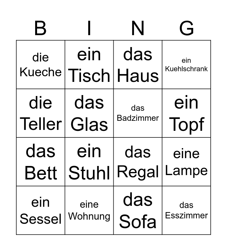 This bingo card has 16 words: eine Wohnung, eine Lampe, das Haus, die Kueche, das Bett, ein Tisch, das Regal, das Sofa, die Teller, das Glas, ein Sessel, ein Kuehlschrank, ein Stuhl, ein Topf, das Badzimmer and das Esszimmer.