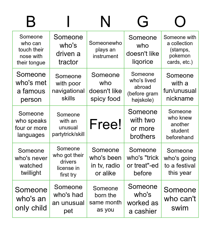 This bingo card has a free space and 24 words: Someone who got their drivers license in first try, Someone who's had an unusual pet, Someone who doesn't like spicy food, Someone who's an only child, Someone with a collection (stamps, pokemon cards, etc.), Someone who can touch their nose with their tongue, Someone who's met a famous person, Someone who's driven a tractor, Someone with two or more brothers, Someone who's been in tv, radio or alike, Someone who's lived abroad (before gram højskole), Someone who speaks four or more languages, Someone who's "trick or treat"-ed before, Someone who's going to a festival this year, Someone with poor navigational skills, Someone who's worked as a cashier, Someone who knew another student beforehand, Someonewho plays an instrument, Someone with a fun/unusual nickname, Someone with an unusual partytrick/skill, Someone who can't swim, Someone who's never watched twillight, Someone who doesn't like liqorice and Someone born the same month as you.