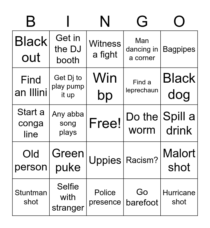 This bingo card has a free space and 24 words: Green puke, Selfie with stranger, Win bp, Stuntman shot, Bagpipes, Black out, Find an Illini, Get in the DJ booth, Do the worm, Uppies, Find a leprechaun, Start a conga line, Racism?, Malort shot, Get Dj to play pump it up, Go barefoot, Spill a drink, Witness a fight, Black dog, Any abba song plays, Hurricane shot, Old person, Man dancing in a corner and Police presence.