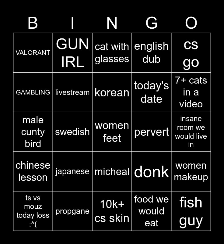 This bingo card has a free space and 24 words: japanese, propgane, korean, ts vs mouz today loss :^(, cs go, VALORANT, GAMBLING, GUN IRL, pervert, micheal, today's date, male cunty bird, donk, women makeup, livestream, food we would eat, insane room we would live in, cat with glasses, 7+ cats in a video, swedish, fish guy, chinese lesson, english dub and 10k+ cs skin.
