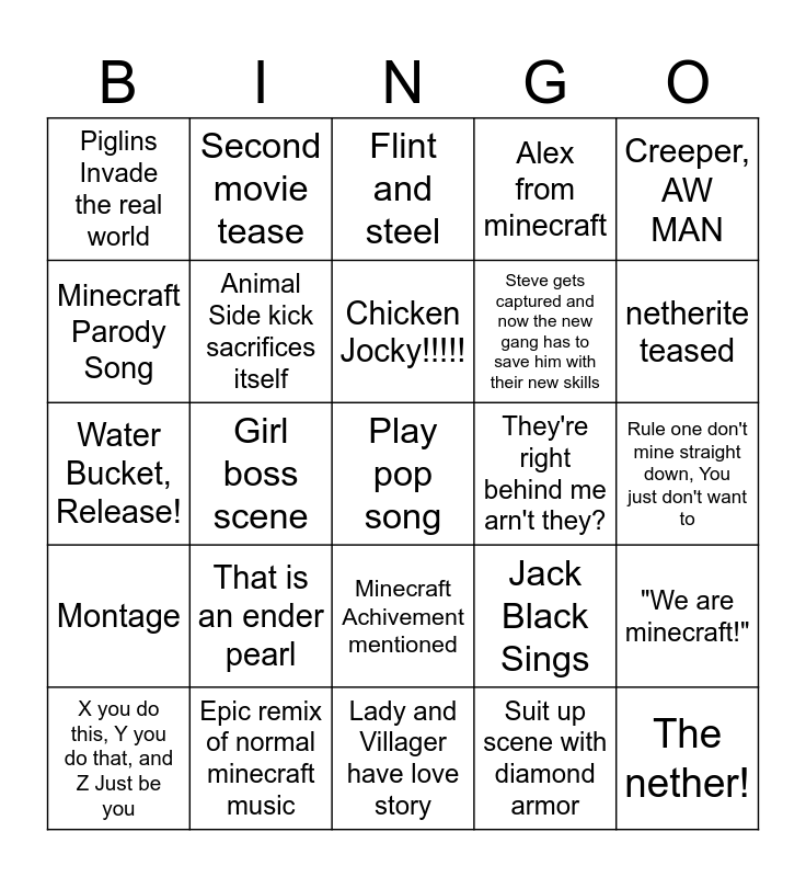 This bingo card has a free space and 24 words: That is an ender pearl, Epic remix of normal minecraft music, Chicken Jocky!!!!!, X you do this, Y you do that, and Z Just be you, Creeper, AW MAN, Piglins Invade the real world, Minecraft Parody Song, Second movie tease, They're right behind me arn't they?, Minecraft Achivement mentioned, Steve gets captured and now the new gang has to save him with their new skills, Water Bucket, Release!, Jack Black Sings, "We are minecraft!", Animal Side kick sacrifices itself, Suit up scene with diamond armor, Rule one don't mine straight down, You just don't want to, Flint and steel, netherite teased, Girl boss scene, The nether!, Montage, Alex from minecraft and Lady and Villager have love story.
