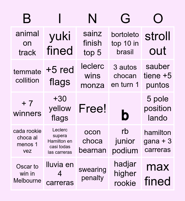 This bingo card has a free space and 24 words: Oscar to win in Melbourne, Leclerc supera Hamilton en casi todas las carreras, leclerc wins monza, hadjar higher rookie, stroll out, animal on track, yuki fined, sainz finish top 5, b, 5 pole position lando, + 7 winners, +5 red flags, rb junior podium, hamilton gana + 3 carreras, temmate collition, lluvia en 4 carreras, swearing penalty, bortoleto top 10 in brasil, sauber tiene +5 puntos, cada rookie choca al menos 1 vez, +30 yellow flags, ocon choca bearnan, 3 autos chocan en turn 1 and max fined.
