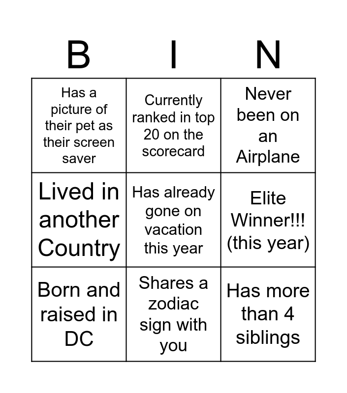 This bingo card has 9 words: Born and raised in DC, Never been on an Airplane, Currently ranked in top 20 on the scorecard, Lived in another Country, Has a picture of their pet as their screen saver, Elite Winner!!! (this year), Has already gone on vacation this year, Has more than 4 siblings and Shares a zodiac sign with you.