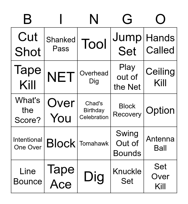 This bingo card has a free space and 29 words: Line Bounce, High Line, Over You, Roll Shot, Cut Shot, Tool, NET, Block, Block Recovery, Tape Ace, Option, Set Over Kill, Dig, Knuckle Set, Ceiling Kill, Ceiling Recovery, Tomahawk, Intentional One Over, Hands Called, What's the Score?, Swing Out of Bounds, Missed Shot, Play out of the Net, Tape Kill, Jump Set, Shanked Pass, Antenna Ball, Overhead Dig and Missed Serve.