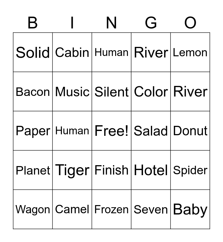 This bingo card has a free space and 24 words: Tiger, Camel, Silent, Wagon, Lemon, Solid, Bacon, Cabin, Salad, Finish, Color, Paper, Hotel, Spider, Music, Seven, Donut, Human, River, Human, Baby, Planet, River and Frozen.