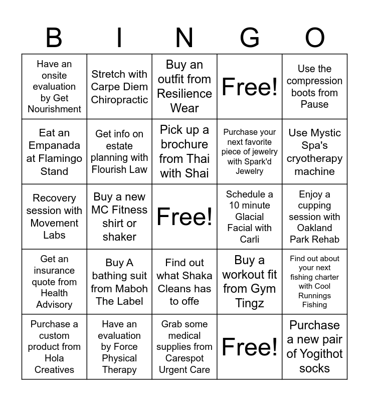 This bingo card has a free space and 24 words: Buy A bathing suit from Maboh The Label, Have an evaluation by Force Physical Therapy, Pick up a brochure from Thai with Shai, Purchase a custom product from Hola Creatives, Use the compression boots from Pause, Have an onsite evaluation by Get Nourishment, Eat an Empanada at Flamingo Stand, Stretch with Carpe Diem Chiropractic, Schedule a 10 minute Glacial Facial with Carli, Find out what Shaka Cleans has to offe, Purchase your next favorite piece of jewelry with Spark'd Jewelry, Recovery session with Movement Labs, Buy a workout fit from Gym Tingz, Find out about your next fishing charter with Cool Runnings Fishing, Get info on estate planning with Flourish Law, Free!, Enjoy a cupping session with Oakland Park Rehab, Buy an outfit from Resilience Wear, Use Mystic Spa's cryotherapy machine, Buy a new MC Fitness shirt or shaker, Purchase a new pair of Yogithot socks, Get an insurance quote from Health Advisory, Free! and Grab some medical supplies from Carespot Urgent Care.