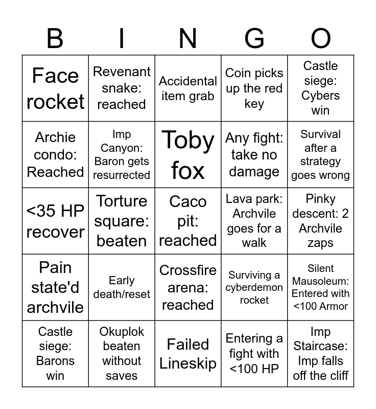 This bingo card has 25 words: Early death/reset, Failed Lineskip, Toby fox, Castle siege: Barons win, Castle siege: Cybers win, Face rocket, Archie condo: Reached, Revenant snake: reached, Lava park: Archvile goes for a walk, Crossfire arena: reached, Any fight: take no damage, <35 HP recover, Surviving a cyberdemon rocket, Silent Mausoleum: Entered with <100 Armor, Imp Canyon: Baron gets resurrected, Imp Staircase: Imp falls off the cliff, Pinky descent: 2 Archvile zaps, Accidental item grab, Survival after a strategy goes wrong, Torture square: beaten, Caco pit: reached, Okuplok beaten without saves, Pain state'd archvile, Coin picks up the red key and Entering a fight with <100 HP.