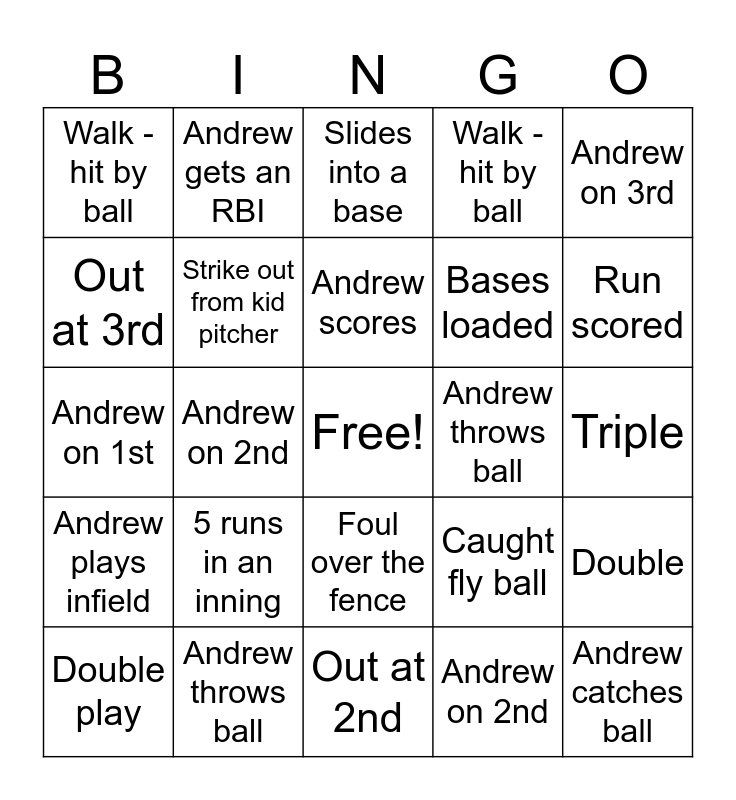 This bingo card has a free space and 128 words: Andrew gets an out, Andrew gets an RBI, Andrew hits a foul, Andrew on 1st, Andrew on 2nd, Andrew on 3rd, Andrew plays infield, Andrew plays outfield, Andrew scores, Andrew stops the ball, Slides into a base, Walk - hit by ball, Coach hits kid, Andrew throws ball, Run scored, Out at 3rd, Out at 2nd, Triple, Hit from kid pitcher, Strike out from kid pitcher, 5 runs in an inning, Bases loaded, Caught fly ball, Double, Double play, Foul over the fence, Andrew catches ball, Andrew gets an out, Andrew gets an RBI, Andrew hits a foul, Andrew on 1st, Andrew on 2nd, Andrew on 3rd, Andrew plays infield, Andrew plays outfield, Andrew scores, Andrew stops the ball, Slides into a base, Walk - hit by ball, Coach hits kid, Andrew throws ball, Run scored, Out at 3rd, Out at 2nd, Triple, Hit from kid pitcher, Strike out from kid pitcher, 5 runs in an inning, Bases loaded, Caught fly ball, Double, Double play, Foul over the fence, Andrew catches ball, Andrew gets an out, Andrew gets an RBI, Andrew hits a foul, Andrew on 1st, Andrew on 2nd, Andrew on 3rd, Andrew plays infield, Andrew plays outfield, Andrew scores, Andrew stops the ball, Slides into a base, Walk - hit by ball, Coach hits kid, Andrew throws ball, Run scored, Out at 3rd, Out at 2nd, Triple, Hit from kid pitcher, Strike out from kid pitcher, 5 runs in an inning, Andrew catches ball, Andrew gets an out, Andrew gets an RBI, Andrew hits a foul, Andrew on 1st, Andrew on 2nd, Andrew on 3rd, Andrew plays infield, Andrew plays outfield, Andrew scores, Andrew stops the ball, Andrew throws ball, Bases loaded, Caught fly ball, Coach hits kid, Double, Double play, Foul over the fence, Hit from kid pitcher, Out at 2nd, Out at 3rd, Run scored, Slides into a base, Strike out from kid pitcher, Triple, Walk - hit by ball, Bases loaded, Caught fly ball, Coach hits kid, Double, Double play, Foul over the fence, Hit from kid pitcher, Out at 2nd, Out at 3rd, Run scored, Slides into a base, Strike out from kid pitcher, Triple, Walk - hit by ball, 5 runs in an inning, Andrew catches ball, Andrew gets an out, Andrew gets an RBI, Andrew hits a foul, Andrew on 1st, Andrew on 2nd, Andrew on 3rd, Andrew plays infield, Andrew plays outfield, Andrew scores, Andrew stops the ball and Andrew throws ball.