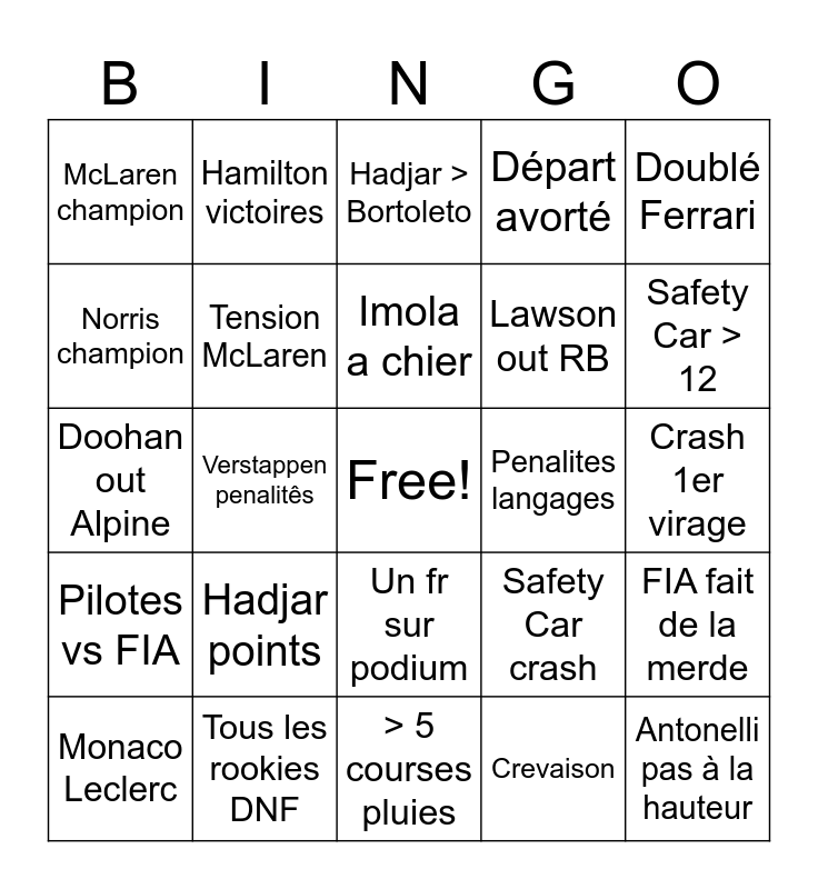 This bingo card has a free space and 24 words: Hadjar points, Tous les rookies DNF, Imola a chier, Monaco Leclerc, Doublé Ferrari, McLaren champion, Norris champion, Hamilton victoires, Penalites langages, Un fr sur podium, Lawson out RB, Doohan out Alpine, Safety Car crash, FIA fait de la merde, Tension McLaren, Crevaison, Crash 1er virage, Hadjar > Bortoleto, Safety Car > 12, Verstappen penalitês, Antonelli pas à la hauteur, Pilotes vs FIA, Départ avorté and > 5 courses pluies.