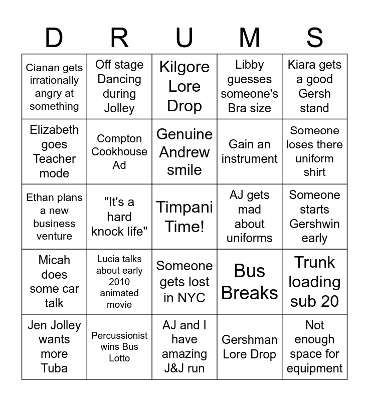 This bingo card has a free space and 24 words: Lucia talks about early 2010 animated movie, Percussionist wins Bus Lotto, Genuine Andrew smile, Jen Jolley wants more Tuba, Kiara gets a good Gersh stand, Cianan gets irrationally angry at something, Elizabeth goes Teacher mode, Off stage Dancing during Jolley, AJ gets mad about uniforms, Someone gets lost in NYC, Gain an instrument, Ethan plans a new business venture, Bus Breaks, Trunk loading sub 20, Compton Cookhouse Ad, Gershman Lore Drop, Someone starts Gershwin early, Kilgore Lore Drop, Someone loses there uniform shirt, "It's a hard knock life", Not enough space for equipment, Micah does some car talk, Libby guesses someone's Bra size and AJ and I have amazing J&J run.