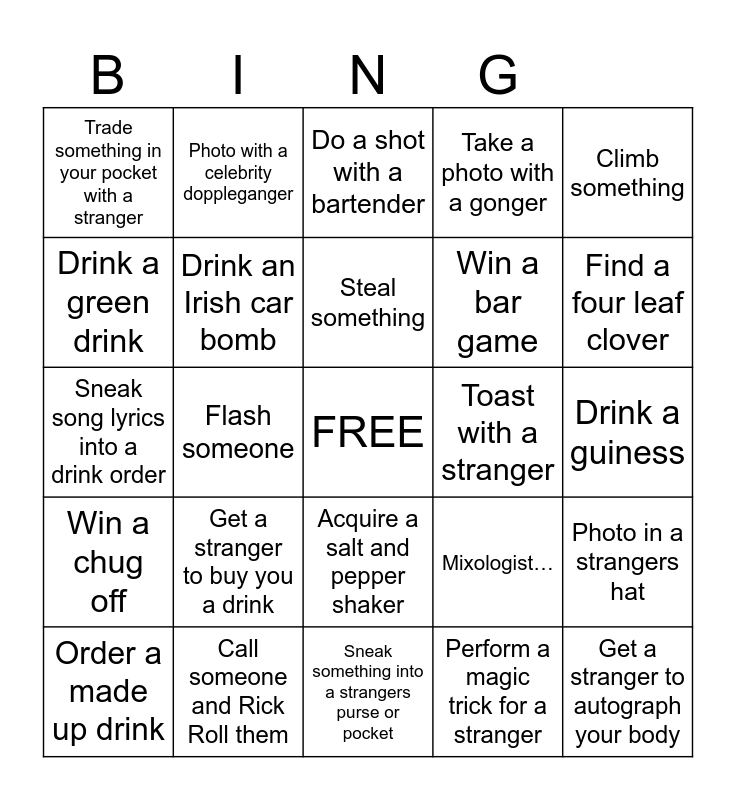 This bingo card has a free space and 24 words: Get a stranger to buy you a drink, Call someone and Rick Roll them, Steal something, Order a made up drink, Climb something, Trade something in your pocket with a stranger, Drink a green drink, Photo with a celebrity doppleganger, Toast with a stranger, Acquire a salt and pepper shaker, Win a bar game, Sneak song lyrics into a drink order, Mixologist…, Photo in a strangers hat, Drink an Irish car bomb, Perform a magic trick for a stranger, Drink a guiness, Do a shot with a bartender, Find a four leaf clover, Flash someone, Get a stranger to autograph your body, Win a chug off, Take a photo with a gonger and Sneak something into a strangers purse or pocket.