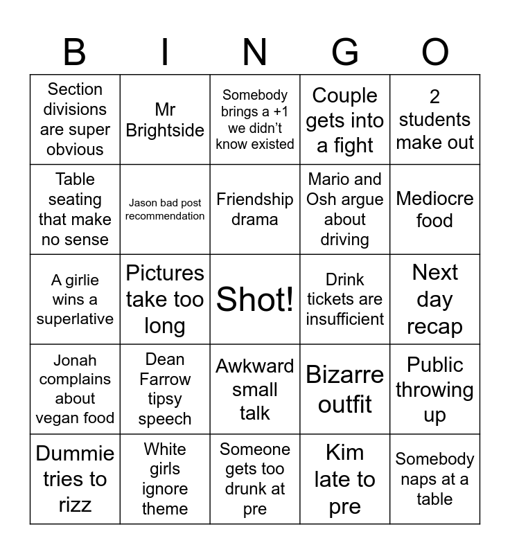 This bingo card has a free space and 24 words: Dean Farrow tipsy speech, White girls ignore theme, Friendship drama, Dummie tries to rizz, 2 students make out, Section divisions are super obvious, Table seating that make no sense, Mr Brightside, Drink tickets are insufficient, Awkward small talk, Mario and Osh argue about driving, A girlie wins a superlative, Bizarre outfit, Public throwing up, Jason bad post recommendation, Kim late to pre, Next day recap, Somebody brings a +1 we didn’t know existed, Mediocre food, Pictures take too long, Somebody naps at a table, Jonah complains about vegan food, Couple gets into a fight and Someone gets too drunk at pre.