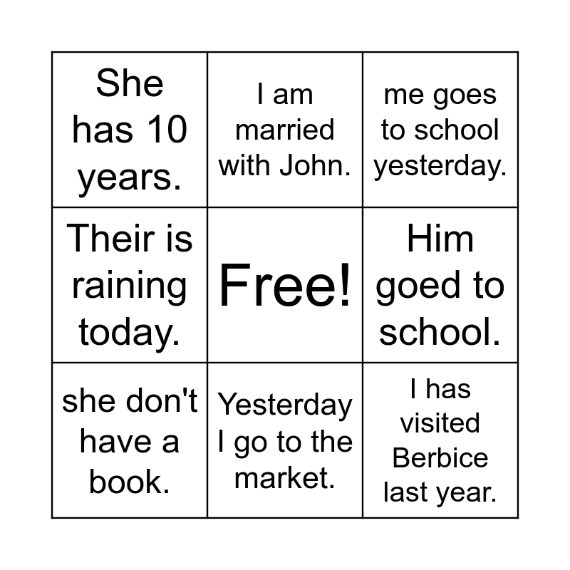 This bingo card has a free space and 9 words: she don't have a book., me goes to school yesterday., I am married with John., Their is raining today., She has 10 years., Him goed to school., I has visited Berbice last year., The red car are beautiful. and Yesterday I go to the market..