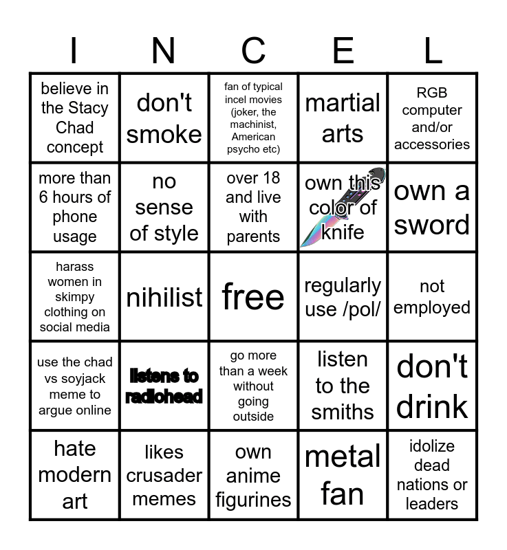 This bingo card has 1 images, a free space and 24 words: listens to radiohead, likes crusader memes, over 18 and live with parents, hate modern art, RGB computer and/or accessories, believe in the Stacy Chad concept, more than 6 hours of phone usage, don't smoke, regularly use /pol/, go more than a week without going outside, own this color of knife, harass women in skimpy clothing on social media, listen to the smiths, don't drink, no sense of style, metal fan, not employed, fan of typical incel movies (joker, the machinist, American psycho etc), own a sword, nihilist, idolize dead nations or leaders, use the chad vs soyjack meme to argue online, martial arts and own anime figurines.