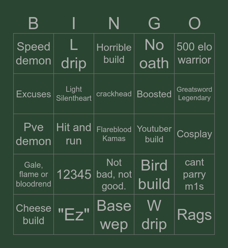 This bingo card has a free space and 24 words: Cheese build, 12345, crackhead, W drip, 500 elo warrior, Speed demon, L drip, Horrible build, Youtuber build, Cosplay, Pve demon, Light Silentheart, Bird build, cant parry m1s, Excuses, "Ez", Base wep, No oath, Greatsword Legendary, Gale, flame or bloodrend, Hit and run, Not bad, not good., Boosted and Rags.