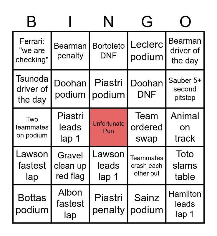 This bingo card has a free space and 214 words: Bortoleto penalty, Front wing replaced, Sainz DNF, McLaren 5+ second pitstop, Hamilton fastest lap, Podium trophy breaks, DRS overtake on DRS activation lap, Bearman fastest lap, Red bull car failure, Bortoleto DNF, Racing Bulls 5+ second pitstop, Hulkenberg leads lap 1, McLaren car failure, Hamilton penalty, Racing Bulls 1-2, Verstappen DNF, Albon driver of the day, Tsunoda penalty, Hadjar penalty, Bortoleto driver of the day, Albon leads lap 1, Sainz leads lap 1, Bortoleto leads lap 1, "Hello crofty!", Two teammates on podium, Piastri penalty, Hadjar fastest lap, Verstappen Podium, Toto slams table, Leclerc driver of the day, Ferrari car failure, Red bull 5+ second pitstop, Russell fastest lap, Lawson penalty, Piastri driver of the day, Driver taps wall, Teammates wheel-to-wheel, Race switches from laps to timed, Verstappen driver of the day, Norris leads lap 1, Alpine car failure, Stroll leads lap 1, Haas 5+ second pitstop, Aston Martin 1-2, Pitlane incident investigation or penalty, Albon fastest lap, Gasly leads lap 1, Hulkenberg penalty, Ocon penalty, Time difference comment by commentators, Max leading 15+ second gap to P2, Gravel clean up red flag, Albon penalty, Haas car failure, Pitlane start, Lawson leads lap 1, First time race winner, Albon podium, Sainz driver of the day, Norris DNF, Any driver: Only soft and mediums used, Gasly podium, Antonelli DNF, Celebrity waves checkered flag, Verstappen penalty, Sauber 5+ second pitstop, Ferrari 5+ second pitstop, Hamilton DNF, Alonso leads lap 1, Tsunoda podium, Antonelli fastest lap, Aston Martin car failure, Sainz penalty, Russell driver of the day, Alonso DNF, Double Aussie points, Bottas podium, Racing Bulls car failure, Bearman penalty, Ocon driver of the day, Rain begins after race start, Gasly driver of the day, Aston Martin 5+ second pitstop, Hadjar podium, Ferrari: "we are checking", Leclerc DNF, Alonso podium, Car on fire, Driver penalty for lining up incorrectly on grid, Mercedes 5+ second pitstop, Verstappen fastest lap, Sauber car failure, Russell DNF, Red flag, Norris fastest lap, Time penalty served during race, Both teammates DNF, Spin in formation lap, Any driver: Only soft and hards used, Antonelli driver of the day, Russell penalty, Bearman leads lap 1, Hadjar leads lap 1, Bearman driver of the day, Any driver: Only mediums and hards used, Red Bull 1-2, "Two seconds, Ted", Piastri leads lap 1, Podium finishers sit in wrong chairs in cooldown room, First points achieved, Mercedes car failure, Teammates crash each other out, Lawson fastest lap, Tsunoda fastest lap, Grand Slam weekend achieved (Pole, Winner, Fastest Lap, and leads every lap of the race), Piastri fastest lap, Norris podium, Gasly fastest lap, Bearman DNF, Antonelli penalty, Ex F1 driver leads post race interview, Alpine 5+ second pitstop, Piastri DNF, Hamilton leads lap 1, Aussie driver podium, Stroll driver of the day, Ocon leads lap 1, Sainz comment on body pain/discomfort, Norris penalty, Sainz singing smooth operator, Max saying "lovely", Alonso fastest lap, Mercedes 1-2, Hadjar driver of the day, Ocon fastest lap, Ocon DNF, Double stack pitstop, Bortoleto fastest lap, "What the **** is he doing?!?", Alpine 1-2, Lawson podium, Russell podium, Engineer told to shut up, Ferrari 1-2, Lewis comment on how bad the car feels, Sainz podium, Stroll podium, Pitlane collision, Car flips, Hulkenberg DNF, Tsunoda driver of the day, First time podium achiever, Leclerc podium, Hamilton driver of the day, Lawson DNF, Albon DNF, Driver lap time deleted, Driver starts podium interview with “Yeah”, DNF in formation lap, Piastri podium, Tsunoda DNF, Leclerc leads lap 1, Alonso driver of the day, Hulkenberg fastest lap, Alonso penalty, Tsunoda leads lap 1, Verstappen podium, Sainz fastest lap, “Incident will be investigated after the race”, Animal on track, "******!" And nothing else, Perez driver of the day, Commentary interrupted by team radio, Norris driver of the day, Lap 1 yellow flag, Williams 5+ second pitstop, Leclerc fastest lap, Russell leads lap 1, Stroll penalty, Stroll fastest lap, Hulkenberg driver of the day, "Press the red button on your controller if you're a SkySports or SkyGlass customer", Hamilton podium, Leclerc penalty, Gravel trap DNF, Verstappen: "the car felt good today", Team ordered swap, Ocon podium, Spin & continues, Stroll DNF, Williams car failure, Hulkenberg podium, Formation lap incident, Bearman podium, Gasly penalty, Bortoleto podium, Any driver: All 3 compounds used, Verstappen leads lap 1, McLaren 1-2, Gasly DNF, Lawson Driver of the Day, Hadjar DNF, Antonelli Podium, Antonelli Leads Lap 1, Doohan penalty, Doohan podium, Doohan fastest lap, Doohan driver of the day, Doohan DNF, Doohan leads lap 1, Mercedes has toasty buns, Swearing Penalty, Sauber 1-2 and Williams 1-2.