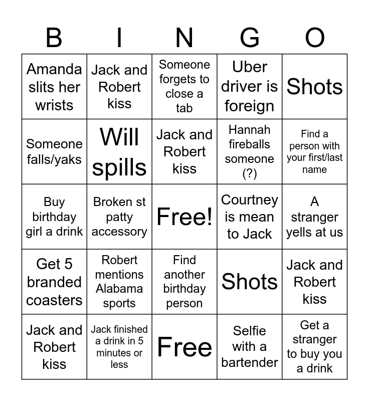 This bingo card has a free space and 29 words: Jack and Robert kiss, Shots, Broken st patty accessory, Leprechaun sighting, Amanda slits her wrists, Someone forgets to close a tab, Will spills, Robert mentions Alabama sports, Courtney is mean to Jack, Jack finished a drink in 5 minutes or less, A stranger yells at us, Get a stranger to buy you a drink, Free, Selfie with a bartender, Find a person with your first/last name, Get someone’s number, Find another birthday person, Get 5 branded coasters, Shots, Buy birthday girl a drink, Shots, Wear a strangers hat or glasses and take a pic, Hannah fireballs someone (?), Someone falls/yaks, Uber driver is foreign, Jack and Robert kiss, Jack and Robert kiss, Jack and Robert kiss and Jack and Robert kiss.