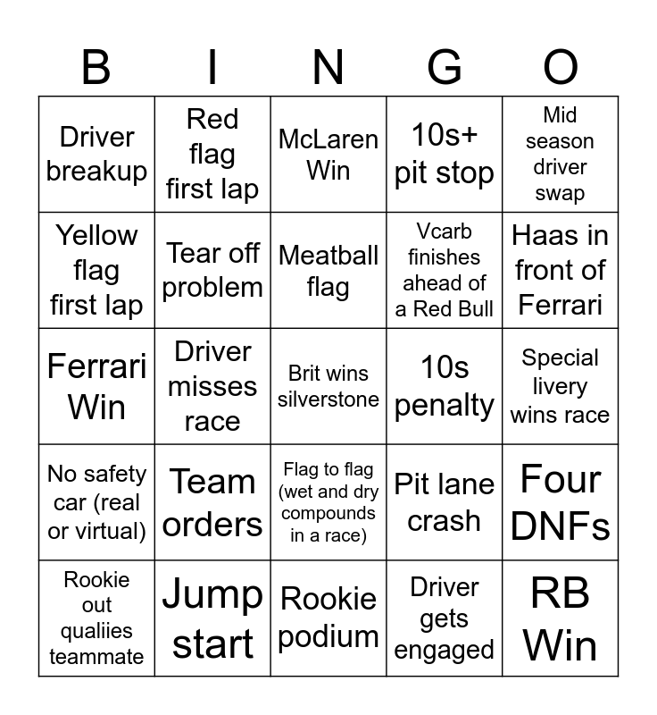 This bingo card has 49 words: Free!, Brit wins silverstone, Teammates crash into each other, Rookie podium, Team orders, Race before last lap, Red flag first lap, Safety car first lap, Yellow flag first lap, Animal on track, Tear off problem, 10s+ pit stop, Four DNFs, Pit lane crash, Back to back DNF driver, Curse fine, Meatball flag, 10s penalty, Driver refers to other driver as idiot, Mid season driver swap, Driver misses race, Driver gets engaged, Driver breakup, Vcarb finishes ahead of a Red Bull, Williams in front of merc, Haas in front of Ferrari, Rookie out qualiies teammate, Max wdc, Flag to flag (wet and dry compounds in a race), No safety car (real or virtual), Rogue wheel or carcass, Crash removes two wheels+, Fire, Countryman wins home race, Jump start, Delayed start, Time cap, Mechanic hit during pit stop, Special livery wins race, Haas Points, Kick Points, SF Red Bull Podium, RB Win, Merc Win, Ferrari Win, McLaren Win, Aston Podium, Williams Podium and Alpine Podium.