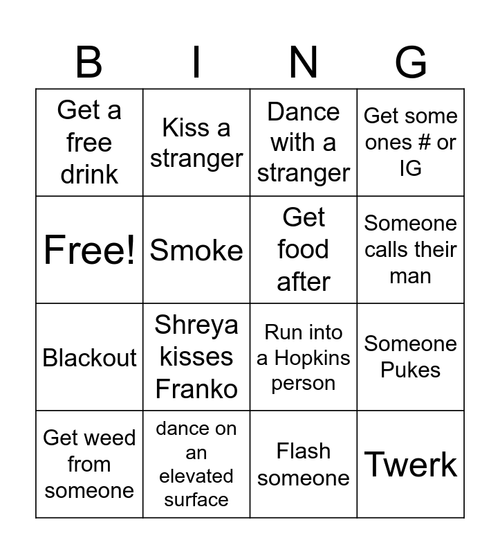 This bingo card has 16 words: dance on an elevated surface, Someone Pukes, Dance with a stranger, Get a free drink, Blackout, Kiss a stranger, Run into a Hopkins person, Flash someone, Free!, Smoke, Get weed from someone, Get some ones # or IG, Shreya kisses Franko, Someone calls their man, Get food after and Twerk.