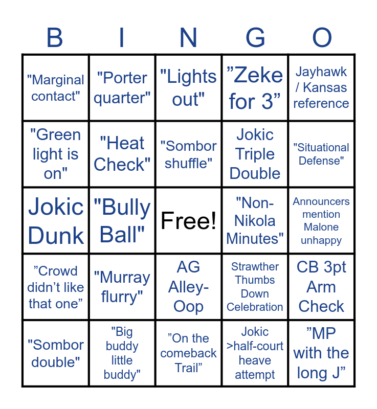 This bingo card has a free space and 24 words: "Murray flurry", "Big buddy little buddy", "Sombor shuffle", "Sombor double", Jayhawk / Kansas reference, "Marginal contact", "Green light is on", "Porter quarter", "Non-Nikola Minutes", AG Alley-Oop, Jokic Triple Double, Jokic Dunk, Strawther Thumbs Down Celebration, CB 3pt Arm Check, "Heat Check", Jokic >half-court heave attempt, Announcers mention Malone unhappy, "Lights out", "Situational Defense", "Bully Ball", ”MP with the long J”, ”Crowd didn’t like that one”, ”Zeke for 3” and ”On the comeback Trail”.