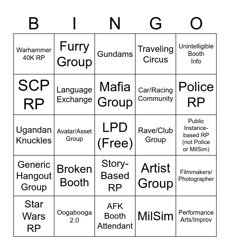 This bingo card has a free space and 24 words: Broken Booth, Oogabooga 2.0, Mafia Group, Star Wars RP, Unintelligible Booth Info, Warhammer 40K RP, SCP RP, Furry Group, Rave/Club Group, Story-Based RP, Car/Racing Community, Ugandan Knuckles, Artist Group, Filmmakers/ Photographer, Language Exchange, MilSim, Public Instance-based RP (not Police or MilSim), Gundams, Police RP, Avatar/Asset Group, Performance Arts/Improv, Generic Hangout Group, Traveling Circus and AFK Booth Attendant.