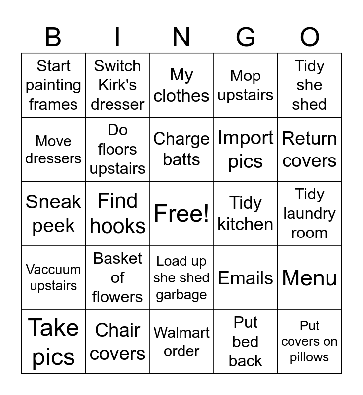 This bingo card has a free space and 24 words: Basket of flowers, Chair covers, Charge batts, Take pics, Tidy she shed, Start painting frames, Move dressers, Switch Kirk's dresser, Tidy kitchen, Load up she shed garbage, Import pics, Sneak peek, Emails, Menu, Do floors upstairs, Put bed back, Tidy laundry room, My clothes, Return covers, Find hooks, Put covers on pillows, Vaccuum upstairs, Mop upstairs and Walmart order.