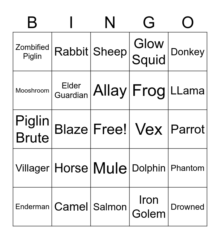 This bingo card has a free space and 78 words: Pig, Cow, Sheep, Wolf, Dog, Llama, Camel, Chicken, Armadillo|, Axolotl, Bat, Cod, Allay, Glow Squid, Squid, Mooshroom, Horse, Mule, Ocelot, Parrot, Pufferfish, Rabbit, Salmon, Frog, Donkey, Cat, Sniffer, Tadpole, Tropical Fish, Turtle, Villager, Bee, Cave Spider, Dolphin, Drowned, Enderman, Fox, Goat, Iron Golem, LLama, Panda, Piglin, Polar Bear, Spider, Trader Llama, Zombified Piglin, Blaze, Bogged, Breeze, Creaking, Creeper, Elder Guardian, Endermite, Evoker, Ghast, Guardian, Hoglin, Husk, Magma Cube, Phantom, Piglin Brute, Pillager, Ravager, Shulker, Silverfish, Skeleton, Slime, Stray, Vex, Vindicator, Warden, Witch, Wither Skeleton, Zoglin, Zombie, Zombie Villager, Ender Dragon and Wither.
