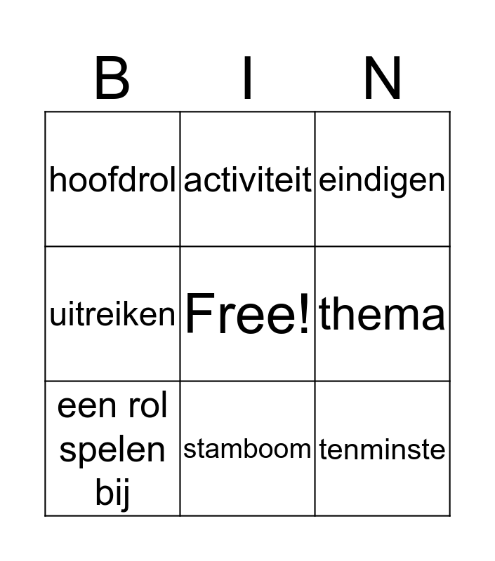 This bingo card has a free space and 8 words: thema, eindigen, activiteit, een rol spelen bij, hoofdrol, tenminste, uitreiken and stamboom.