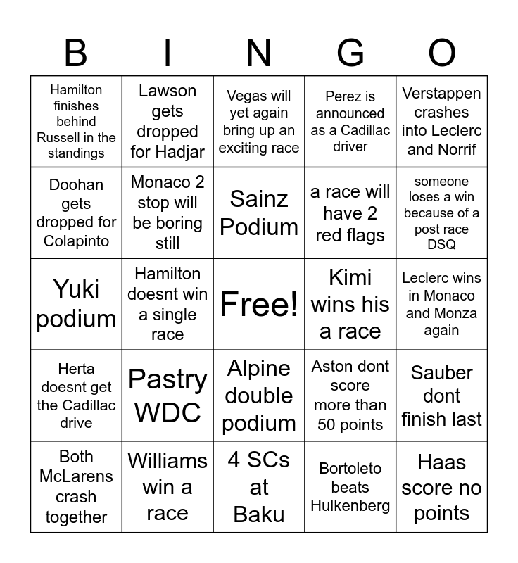 This bingo card has a free space and 24 words: Pastry WDC, Williams win a race, Sainz Podium, Both McLarens crash together, Verstappen crashes into Leclerc and Norrif, Hamilton finishes behind Russell in the standings, Doohan gets dropped for Colapinto, Lawson gets dropped for Hadjar, Kimi wins his a race, Alpine double podium, a race will have 2 red flags, Yuki podium, Aston dont score more than 50 points, Sauber dont finish last, Monaco 2 stop will be boring still, Bortoleto beats Hulkenberg, Leclerc wins in Monaco and Monza again, Vegas will yet again bring up an exciting race, someone loses a win because of a post race DSQ, Hamilton doesnt win a single race, Haas score no points, Herta doesnt get the Cadillac drive, Perez is announced as a Cadillac driver and 4 SCs at Baku.
