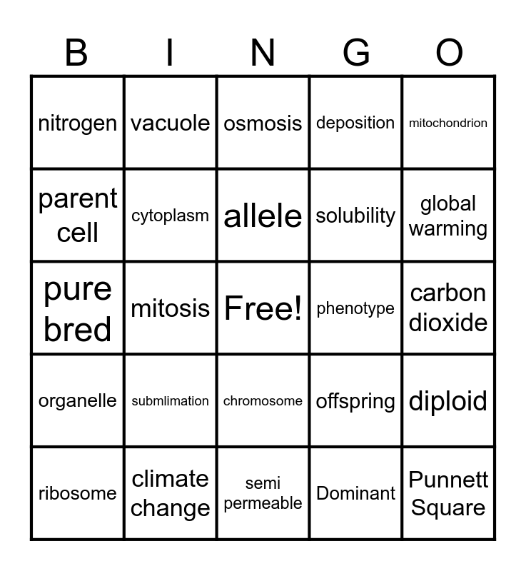 This bingo card has a free space and 34 words: Recessive, Dominant, Homozygous, Heterozygous, organelle, cytoplasm, mitochondrion, ribosome, vacuole, prophase, allele, osmosis, anaphase, genotype, phenotype, global warming, climate change, pure bred, submlimation, offspring, chromosome, haploid, nitrogen, carbon dioxide, semi permeable, Punnett Square, deposition, daughter cell, solubility, parent cell, mutation, mitosis, diploid and chemical reactivity.