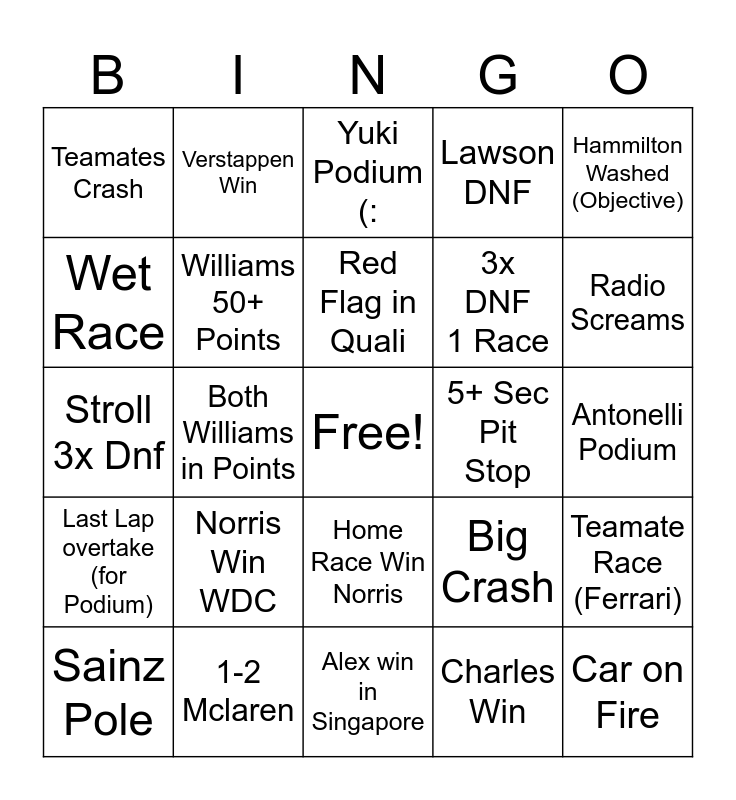This bingo card has a free space and 24 words: Norris Win WDC, 1-2 Mclaren, Red Flag in Quali, Sainz Pole, Hammilton Washed (Objective), Teamates Crash, Wet Race, Verstappen Win, 5+ Sec Pit Stop, Home Race Win Norris, 3x DNF 1 Race, Stroll 3x Dnf, Big Crash, Teamate Race (Ferrari), Williams 50+ Points, Charles Win, Antonelli Podium, Yuki Podium (:, Radio Screams, Both Williams in Points, Car on Fire, Last Lap overtake (for Podium), Lawson DNF and Alex win in Singapore.