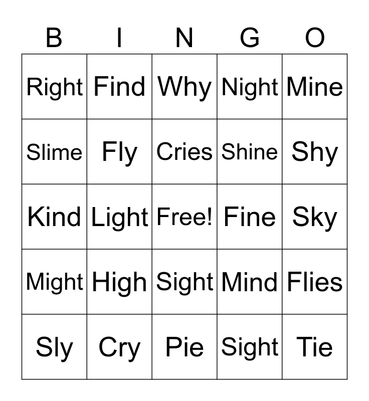 This bingo card has a free space and 24 words: High, Cry, Cries, Sly, Mine, Right, Slime, Find, Fine, Sight, Shine, Kind, Mind, Flies, Fly, Sight, Sky, Why, Shy, Light, Tie, Might, Night and Pie.