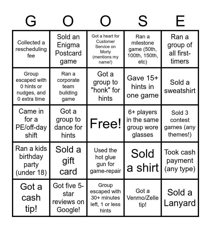 This bingo card has a free space and 24 words: Sold a gift card, Got five 5-star reviews on Google!, Got a group to "honk" for hints, Got a cash tip!, Ran a group of all first-timers, Collected a rescheduling fee, Group escaped with 0 hints or nudges, and 0 extra time, Sold an Enigma Postcard game, 6+ players in the same group wore glasses, Used the hot glue gun for game-repair, Gave 15+ hints in one game, Came in for a PE/off-day shift, Sold a shirt, Took cash payment (any type), Ran a corporate team building game, Got a Venmo/Zelle tip!, Sold 3 contest games (any themes!), Got a heart for Customer Service on Morty (mentions my name!), Sold a sweatshirt, Got a group to dance for hints, Sold a Lanyard, Ran a kids birthday party (under 18), Ran a milestone game (50th, 100th, 150th, etc) and Group escaped with 30+ minutes left, 1 or less hints.