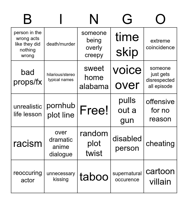 This bingo card has a free space and 24 words: over dramatic anime dialogue, unnecessary kissing, sweet home alabama, reoccuring actor, extreme coincidence, person in the wrong acts like they did nothing wrong, bad props/fx, death/murder, pulls out a gun, random plot twist, voice over, unrealistic life lesson, disabled person, cheating, hilarious/stereo typical names, supernatural occurence, offensive for no reason, someone being overly creepy, someone just gets disrespected all episode, pornhub plot line, cartoon villain, racism, time skip and taboo.