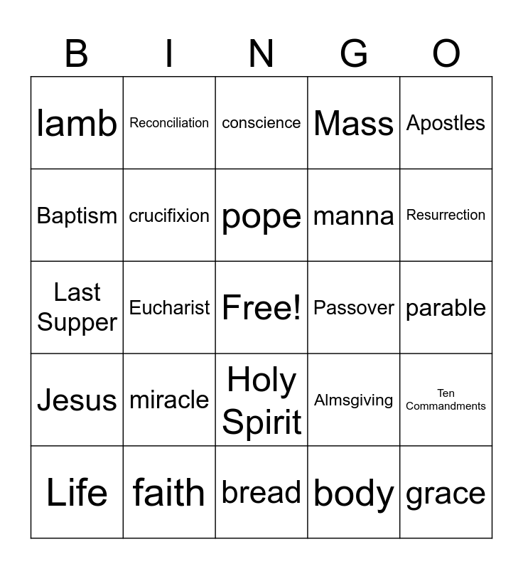 This bingo card has a free space and 24 words: miracle, faith, pope, Life, Apostles, lamb, Baptism, Reconciliation, Passover, Holy Spirit, manna, Last Supper, Almsgiving, Ten Commandments, crucifixion, body, parable, conscience, Resurrection, Eucharist, grace, Jesus, Mass and bread.