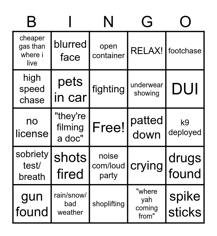 This bingo card has a free space and 24 words: shots fired, rain/snow/ bad weather, fighting, gun found, footchase, cheaper gas than where i live, high speed chase, blurred face, patted down, noise com/loud party, underwear showing, no license, crying, drugs found, pets in car, "where yah coming from", k9 deployed, open container, DUI, "they're filming a doc", spike sticks, sobriety test/ breath, RELAX! and shoplifting.