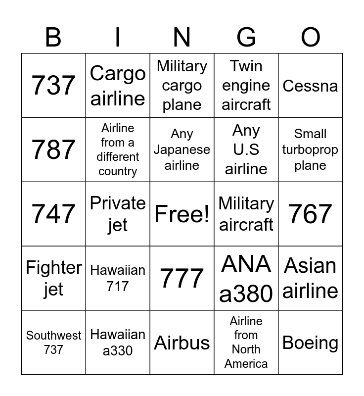 This bingo card has a free space and 24 words: Hawaiian 717, Hawaiian a330, Any Japanese airline, Southwest 737, Cessna, 737, 787, Cargo airline, Military aircraft, 777, Any U.S airline, 747, ANA a380, Asian airline, Airline from a different country, Airline from North America, 767, Military cargo plane, Small turboprop plane, Private jet, Boeing, Fighter jet, Twin engine aircraft and Airbus.