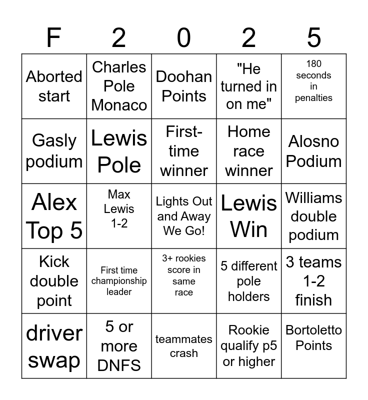 This bingo card has a free space and 27 words: 5 different pole holders, Curse broken, Home race winner, teammates crash, Gasly podium, Doohan Points, Charles Pole Monaco, Kick double point, Lewis Win, 3 teams 1-2 finish, Alex Top 5, "He turned in on me", driver swap, 5 or more DNFS, Alosno Podium, 8 different teams score points in a race, Lewis Pole, First-time winner, First time championship leader, Aborted start, Williams double podium, Rookie qualify p5 or higher, Max Lewis 1-2, Bortoletto Points, 3+ rookies score in same race, 180 seconds in penalties and 5 different race winners.