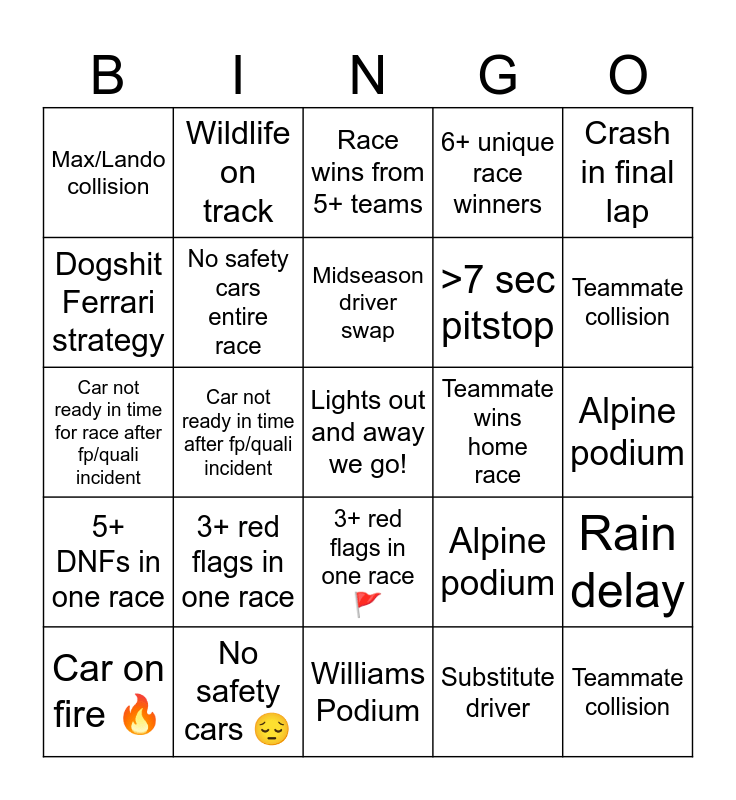 This bingo card has a free space and 48 words: At least one rookie on podium, Teammate collision, Car on fire!!, Williams Podium, 3+ red flags in one race, 5+ DNFs in one race, Wildlife on track, Home race win, Dogshit Ferrari strategy, <1.9 sec pitstop, No safety cars entire race, 6+ unique race winners, Rain delay, Alpine podium, Both vcarbs outqualify Red Bull, At least one Sauber in Q3, Midseason driver swap, Teammate wins home race, Race wins from 5+ teams, Crash in final lap, Car not ready in time after fp/quali incident, Substitute driver, Max/Lando collision, >7 sec pitstop, At least one Rookie on podium 👶, Teammate collision, Car on fire 🔥, Williams podium, 3+ red flags in one race 🚩, 5+ DNFs in one race, Wildlife on track 🦎, Home race win, Dogshit Ferrari strategy 🤡, <1.9 second pitstop, No safety cars 😔, 6+ unique winners, Rain delay ☔️, Alpine podium, Both vcarbs out qualify Red Bull, At least one sauber in q3, Mid season driver swap, Teammate wins home race, Race wins from 5+ teams, Crash in final lap, Car not ready in time for race after fp/quali incident, Substitute driver, Max/Lando collision and >7 second pit stop.