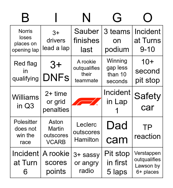 This bingo card has a free space and 27 words: Dad cam, Piastri Podium™️, Winning gap less than 10 seconds, 3+ sassy or angry radio, Red flag in qualifying, Sauber finishes last, 3+ drivers lead a lap, Polesitter does not win the race, Incident in Lap 1, TP reaction, Williams in Q3, 3 teams on podium, Incident at Turn 6, A rookie scores points, 10+ second pit stop, Rookie crash, 3+ DNFs, A rookie outqualifies their teammate, Aston Martin outscores VCARB, Norris loses places on opening lap, Safety car, Pit stop in first 5 laps, 2+ time or grid penalties, Verstappen outqualifies Lawson by 6+ places, Leclerc outscores Hamilton, Incident at Turns 9-10 and Incident at Turn 3.