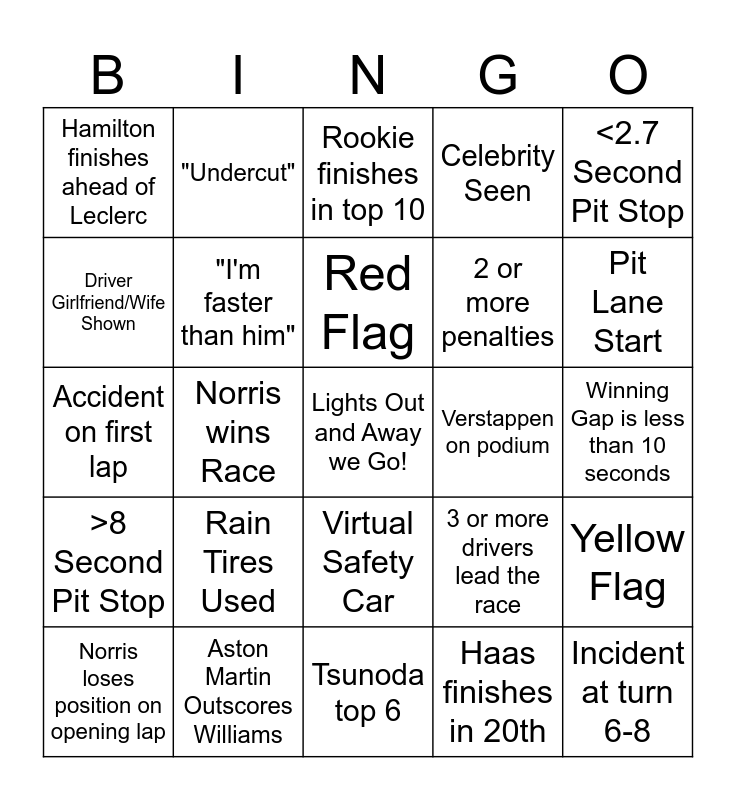 This bingo card has a free space and 29 words: Norris loses position on opening lap, Lawson finishes in top 10, Norris wins Race, Verstappen fastest lap, Hamilton finishes ahead of Leclerc, Rookie finishes in top 10, "I'm faster than him", Rain Tires Used, Verstappen on podium, Aston Martin Outscores Williams, Winning Gap is less than 10 seconds, Incident at turn 6-8, Tsunoda top 6, Haas finishes in 20th, Pit Lane Start, Safety Car, Virtual Safety Car, >8 Second Pit Stop, <2.7 Second Pit Stop, Accident on first lap, 3 or more drivers lead the race, 3 or more DNFs, 2 or more penalties, Driver Girlfriend/Wife Shown, Celebrity Seen, "Undercut", Yellow Flag, Red Flag and Driver Complains about Tires.
