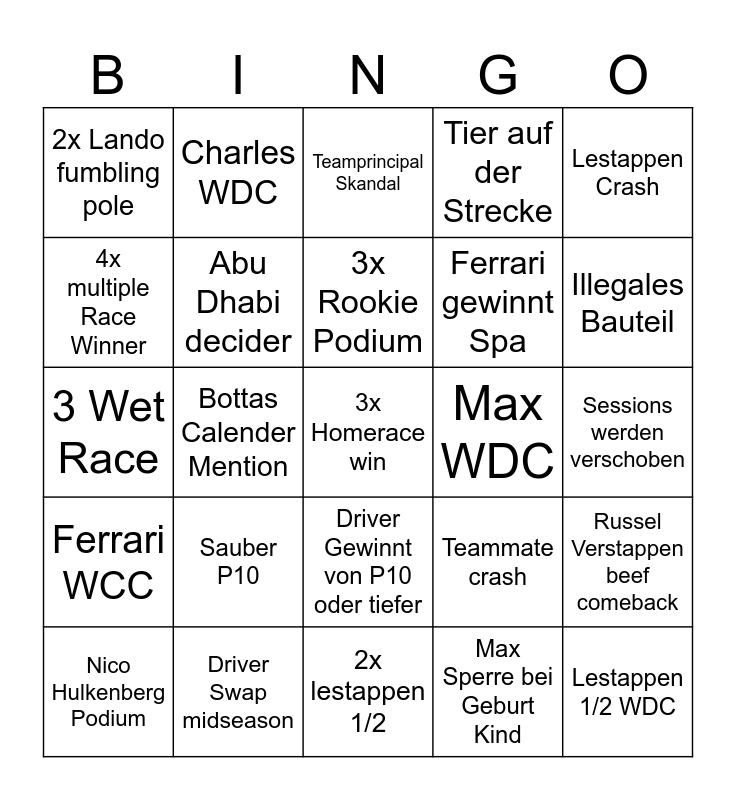 This bingo card has a free space and 24 words: Sauber P10, Driver Swap midseason, 3x Rookie Podium, Nico Hulkenberg Podium, Lestappen Crash, 2x Lando fumbling pole, 4x multiple Race Winner, Charles WDC, Max WDC, Driver Gewinnt von P10 oder tiefer, Ferrari gewinnt Spa, 3 Wet Race, Teammate crash, Russel Verstappen beef comeback, Abu Dhabi decider, Max Sperre bei Geburt Kind, Sessions werden verschoben, Teamprincipal Skandal, Illegales Bauteil, Bottas Calender Mention, Lestappen 1/2 WDC, Ferrari WCC, Tier auf der Strecke and 2x lestappen 1/2.