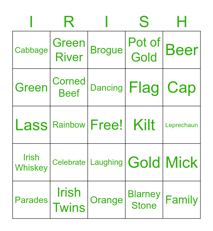 This bingo card has a free space and 39 words: Lucky, Irish, Clovers, Corned Beef, Parades, Laughing, Dancing, Irish Jig, Beer, Irish Whiskey, Rainbow, Pot of Gold, Family, Leprechaun, Kilt, Celebrate, Soda Bread, Cabbage, Potatoes, Gold, Green, Orange, Flag, Cap, Music, Singing, Dinner, Bagpipes, Ireland, Green River, Marching, Top 'O the Morning, Brogue, Irish Twins, Blarney Stone, Irish Wool, Mick, Lass and Lad.
