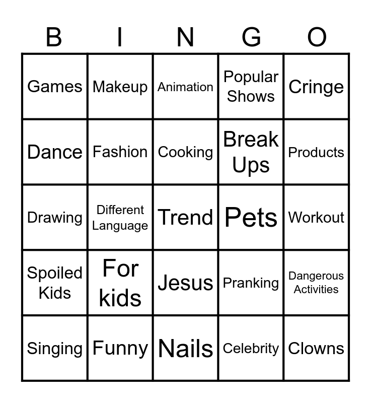 This bingo card has a free space and 24 words: For kids, Funny, Cooking, Singing, Cringe, Games, Dance, Makeup, Pets, Jesus, Break Ups, Drawing, Pranking, Dangerous Activities, Fashion, Celebrity, Workout, Animation, Products, Different Language, Clowns, Spoiled Kids, Popular Shows and Nails.