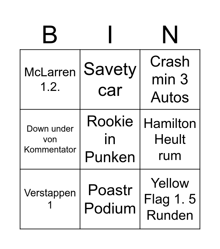 This bingo card has a free space and 8 words: Hamilton Heult rum, Crash min 3 Autos, Savety car, Verstappen 1, McLarren 1.2., Yellow Flag 1. 5 Runden, Down under von Kommentator and Poastr Podium.